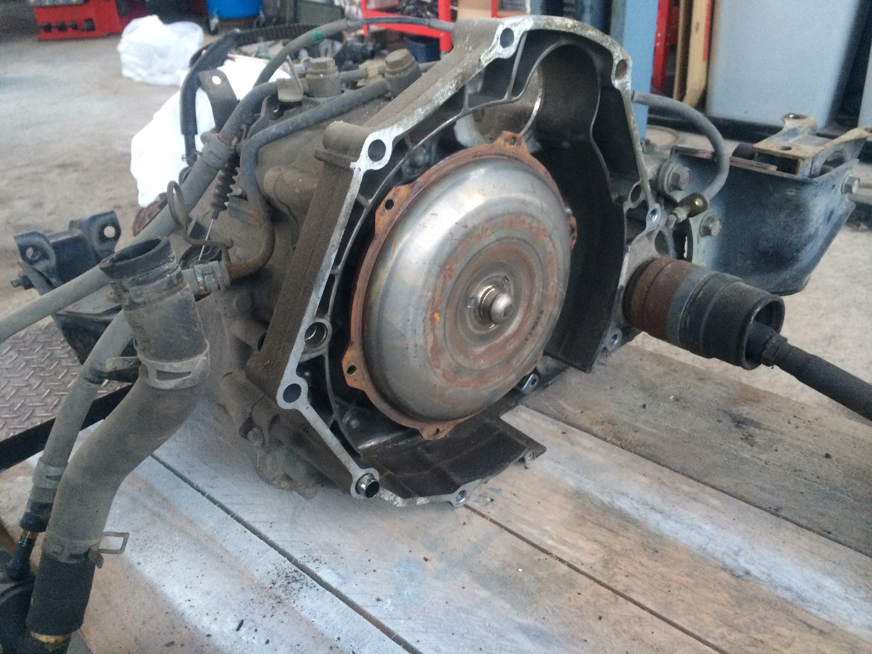 フライホイールとコンバーターを止めているボルトはエンジンを下ろす前に外しておきました。 下側にあるため下ろしてからだとやりづらいからです。  なのでエンジン、ミッションを止めているボルトを外すと簡単にミッションは外れます。