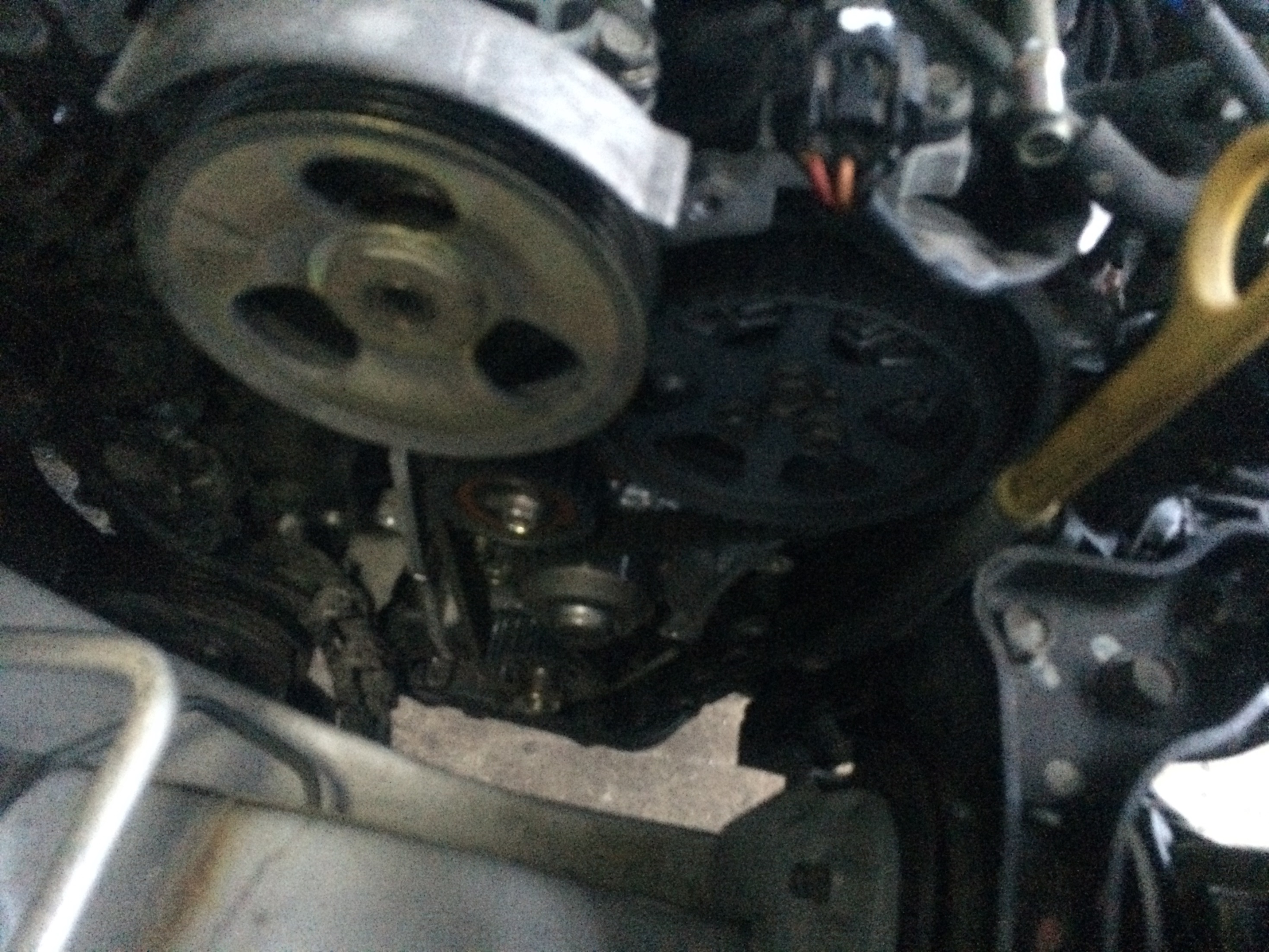 クランクプーリーを外さないとカバーが外れないので、順序よく外していきます。 タイベルカバーを外して中の様子が見えてきました。