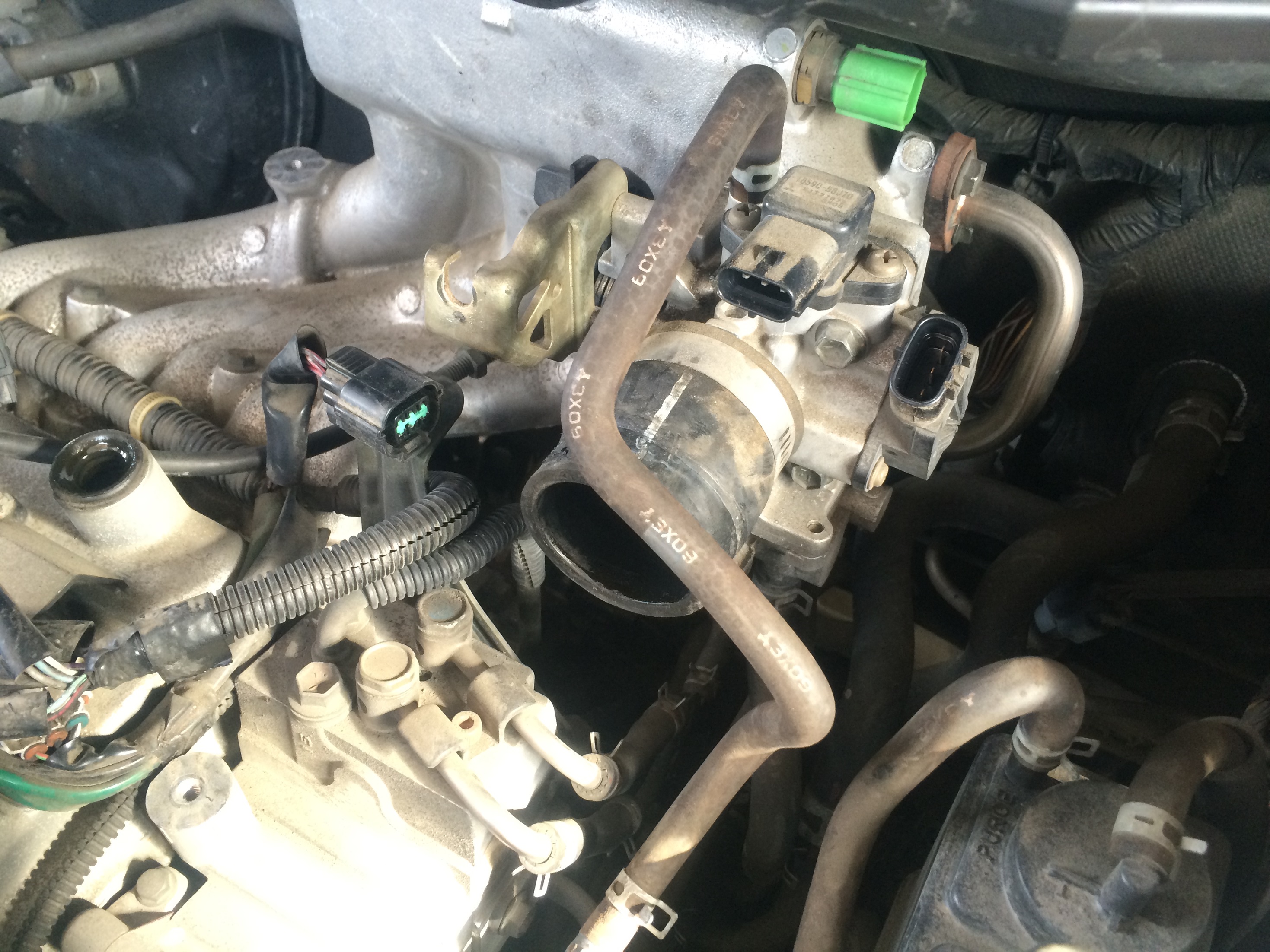 不具合の出たISCバルブを取り外します。 ISCバルブをケースごと外すためスロットルボディごと外してからの交換となります。 スロットルボディが外れました。