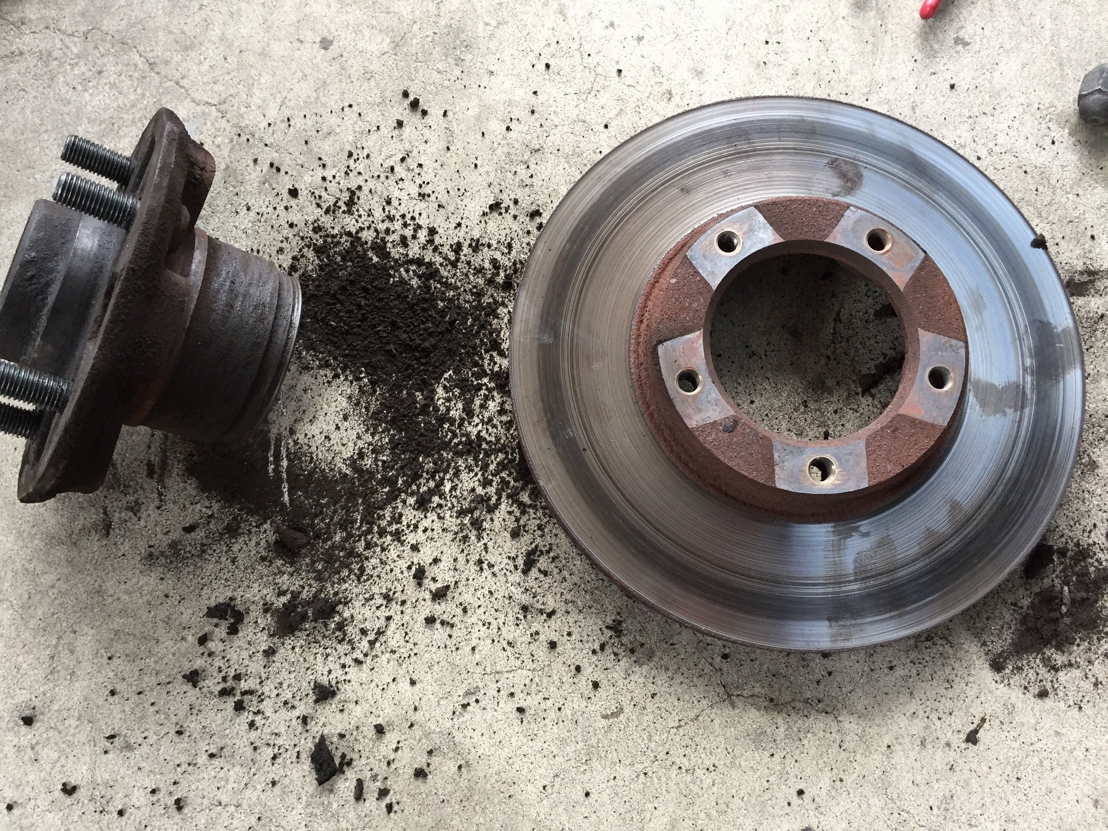 ボルトで固定されているのでボルトをハズしましたが・・・固着していたのでプレスを使用してディスクローターを取り外します。 そして・・・約36万キロ分のカス?と共に外れました(汗)