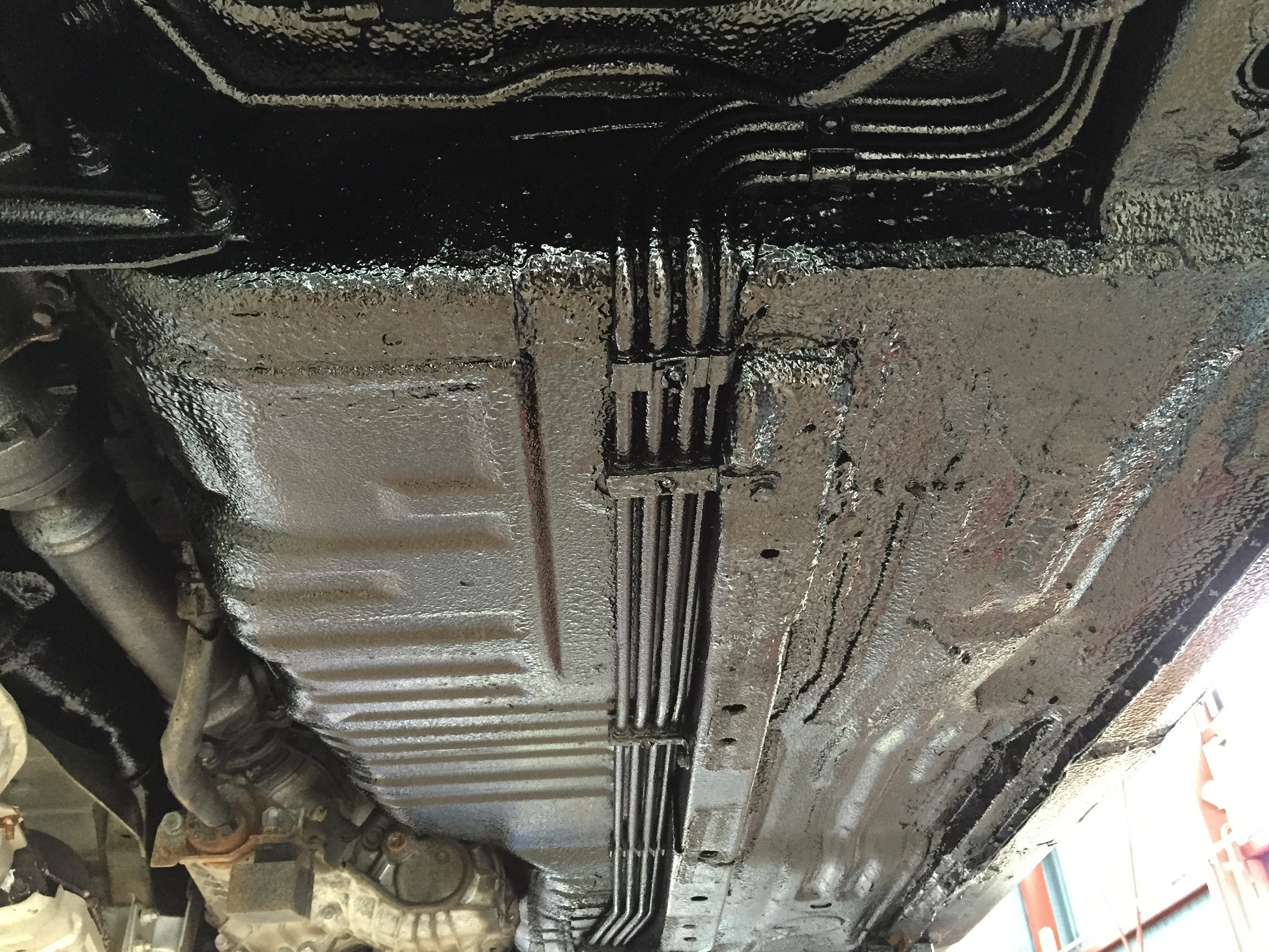 浸透剤を各部に充填したらUM-1600吹き付けのための準備開始です。 車体下部に防錆塗装室の完成です(笑)