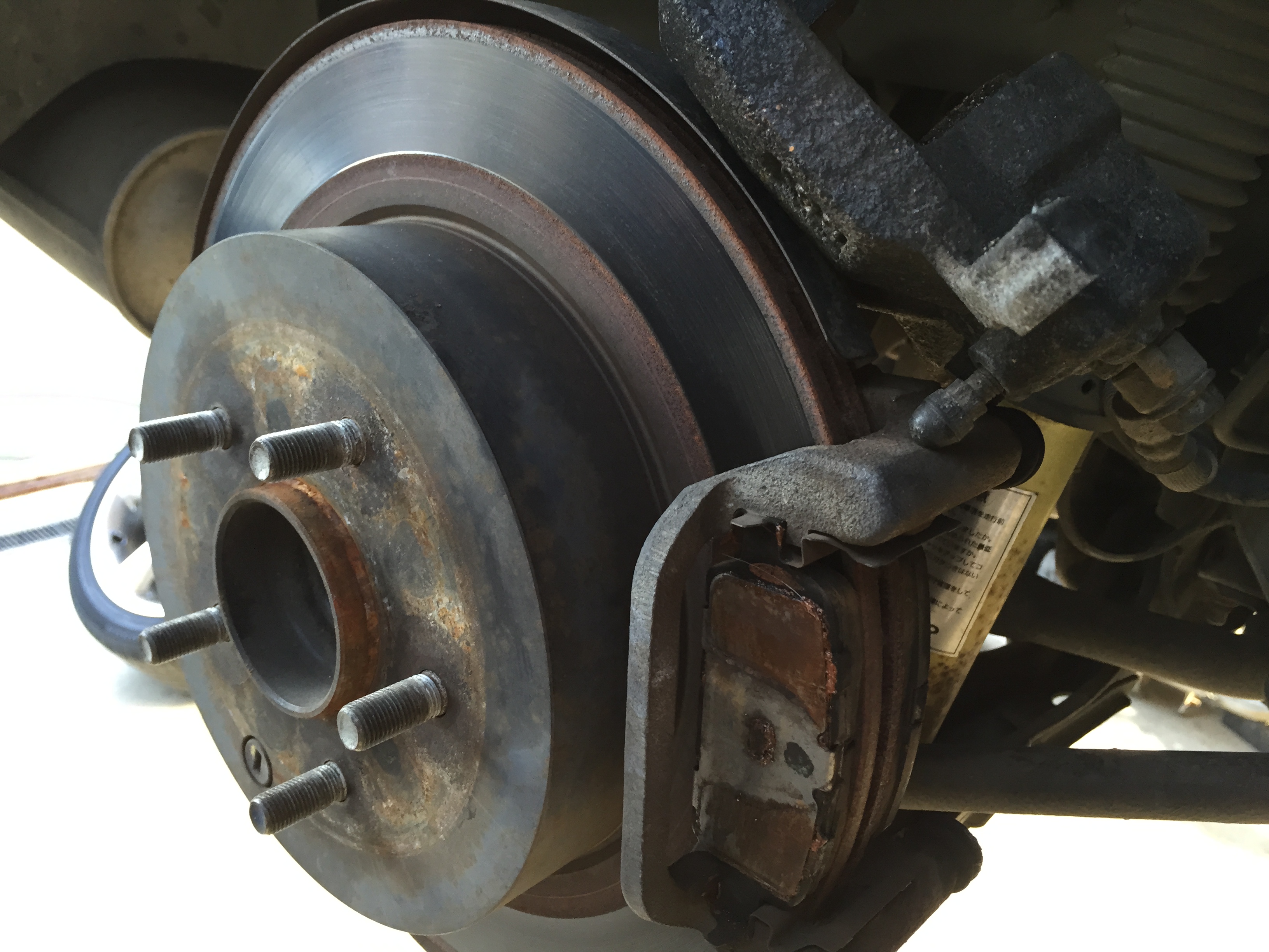 リヤブレーキ点検です。 右側のキャリパーは以前固着で中古部品を使用して交換済みですが、今回は問題なしです。 パッド、スライドピン、キャリパーピストンOKです!