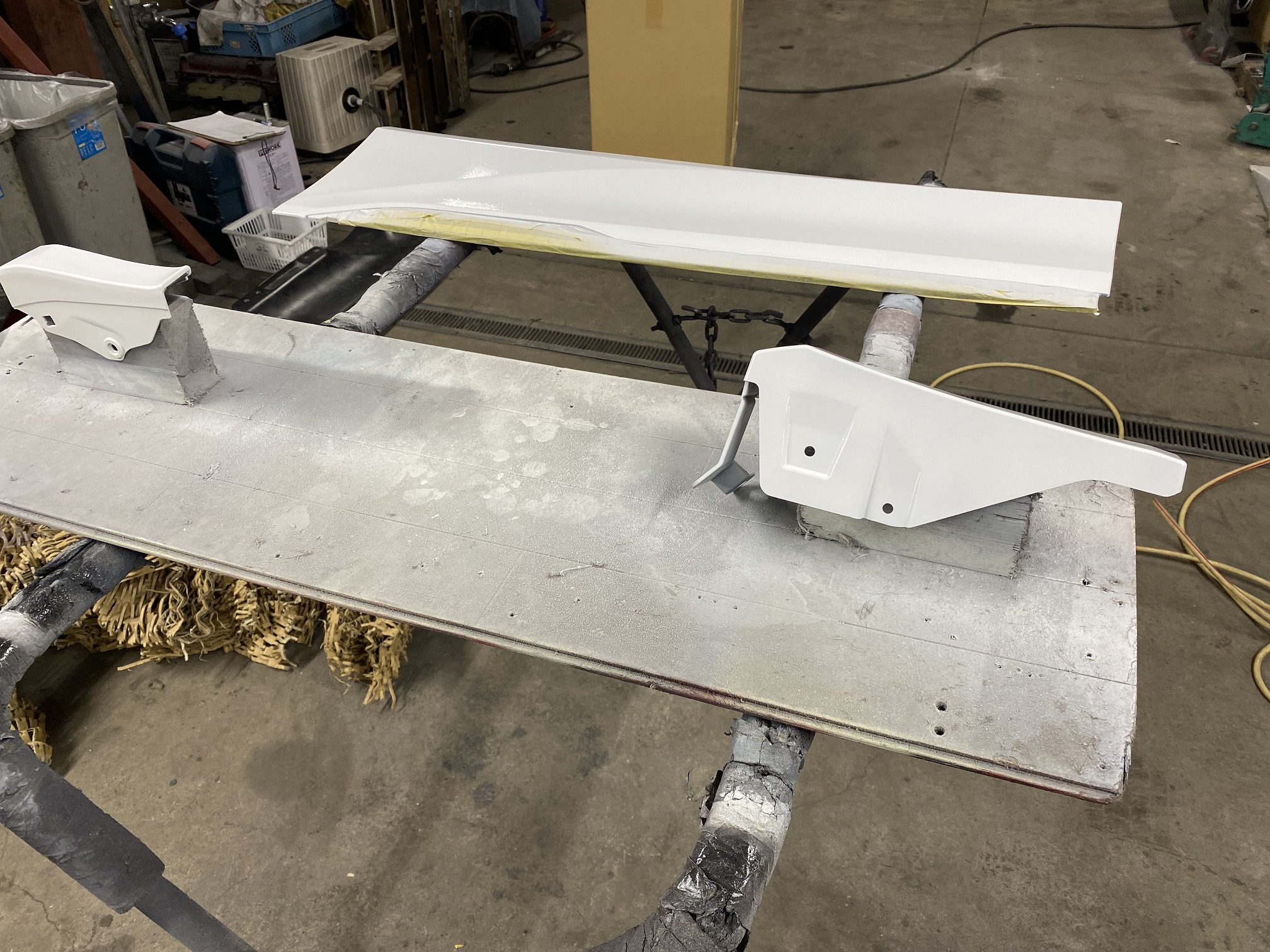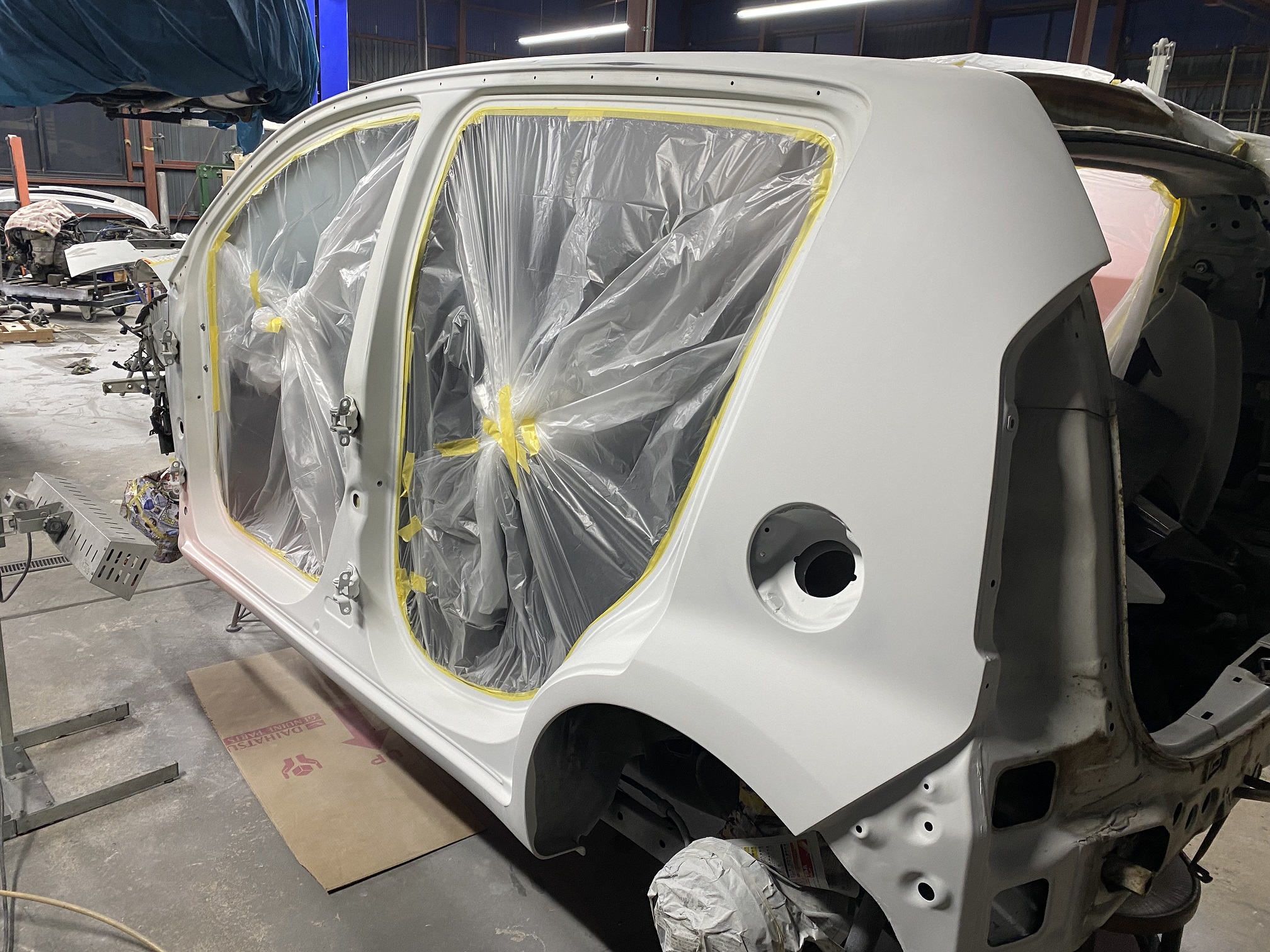 バックドア、ボンネットも取り外しボディ開口部の塗装準備へと入っています。