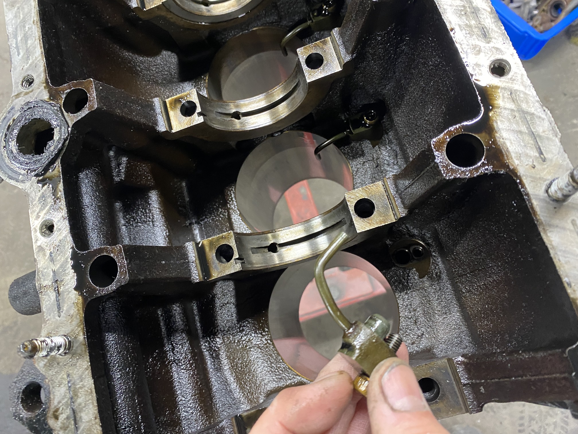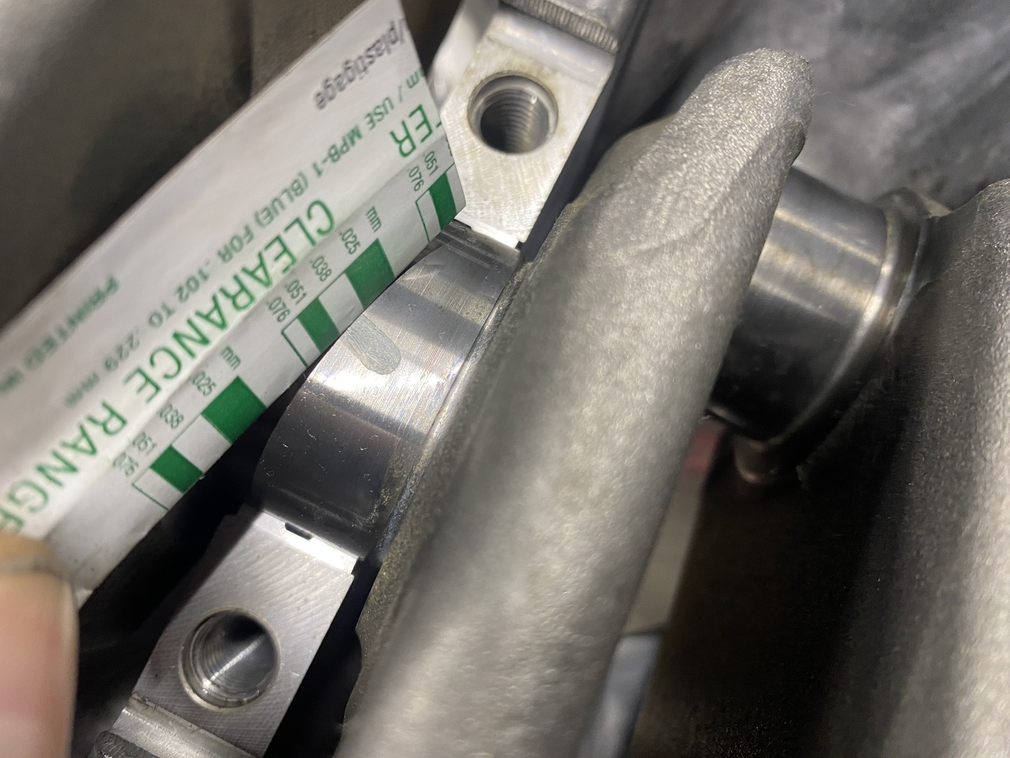 再度クランクキャップを取り外しオイルクリアランスを計測していきます。