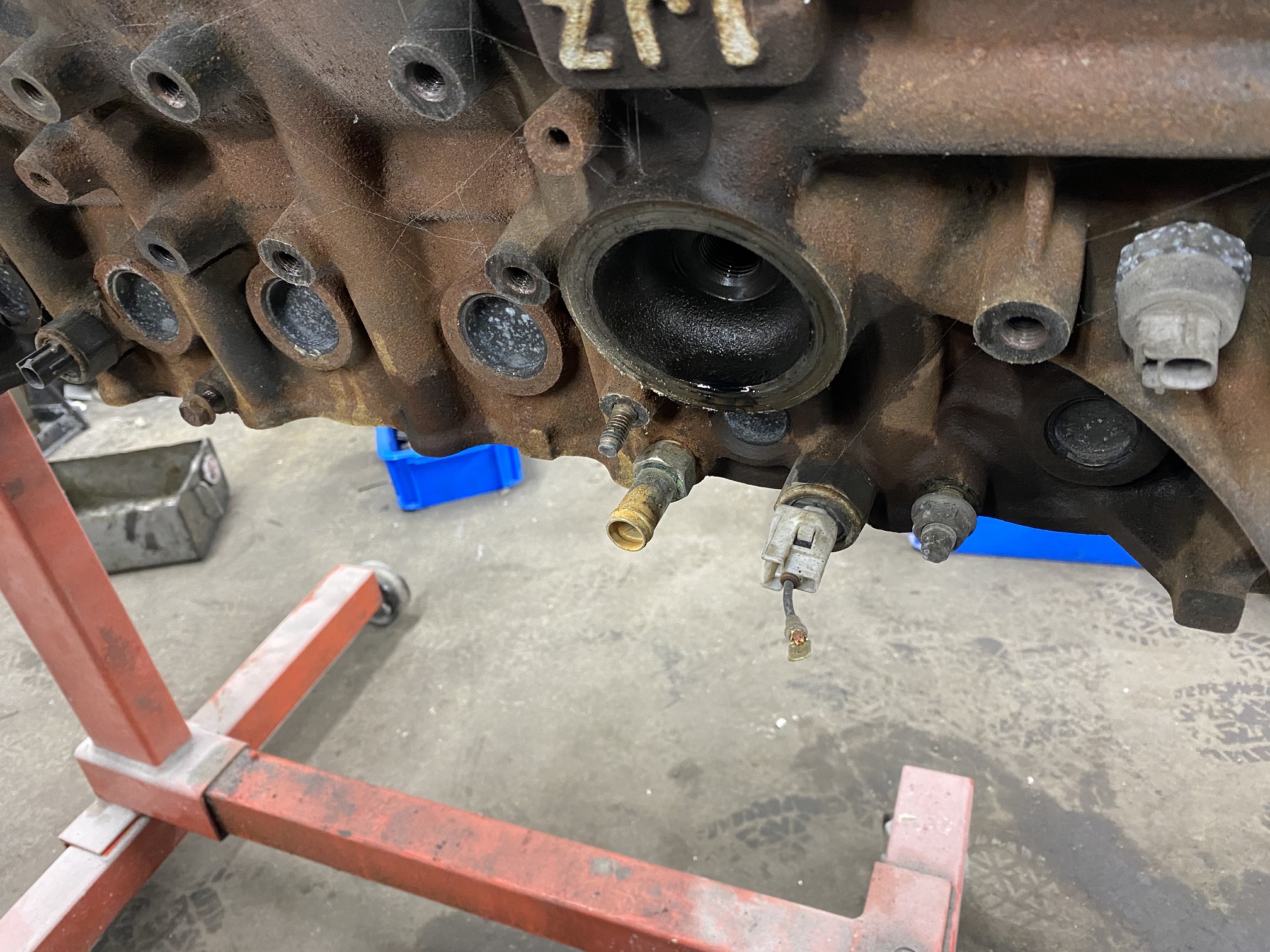オイルジェットやセンサー類の取り外しを行いシリンダーブロックを丸裸にしています。