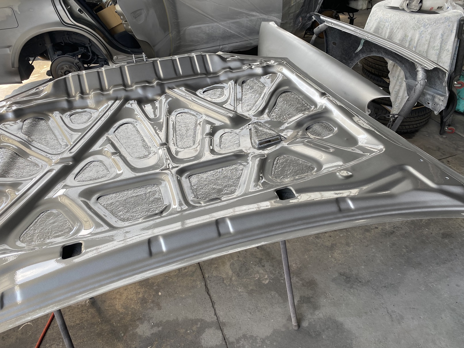 リアフェンダー製作完了し、ドア開口部やボンネットの裏側、フロントフェンダーの隠れる部分の塗装をしました。
