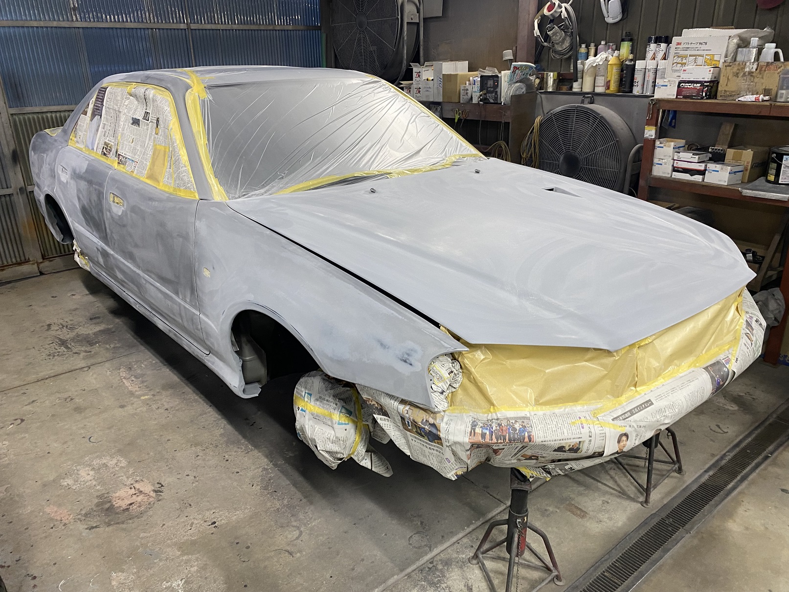 ボンネットやフロントフェンダーを取付け、塗装準備をしています。