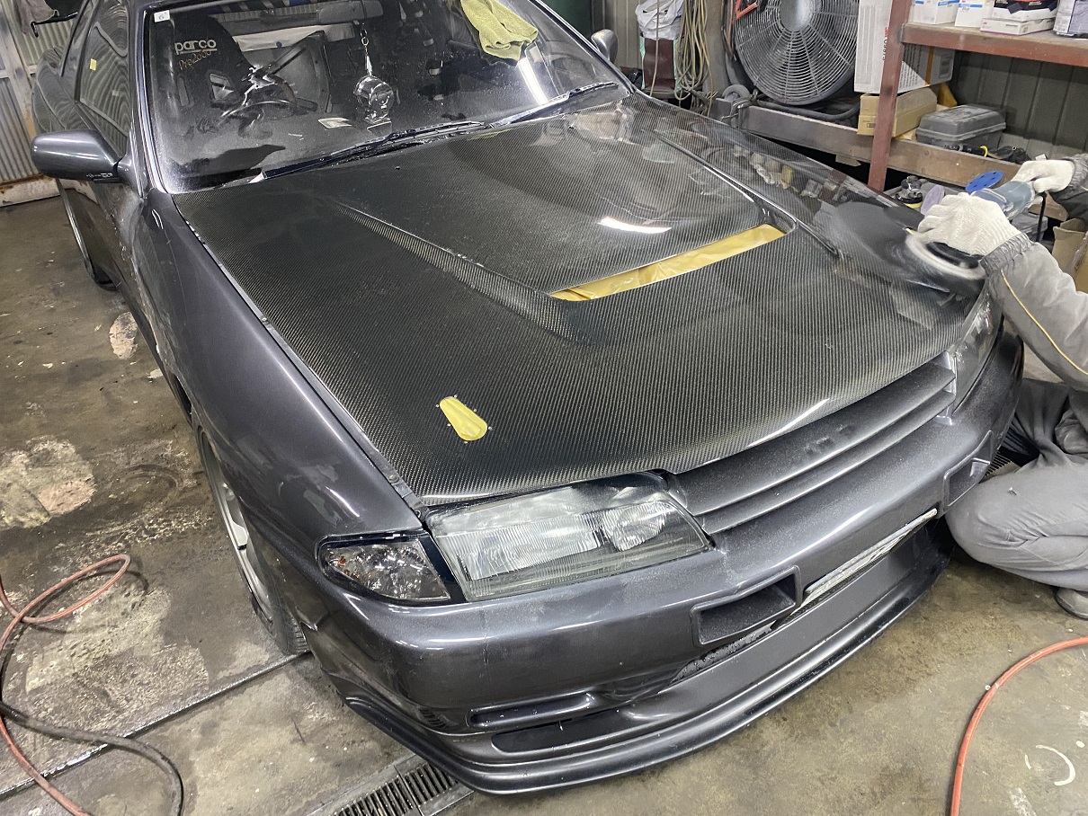 クリア塗装したボンネットを磨き上げ各部品を取付けています。