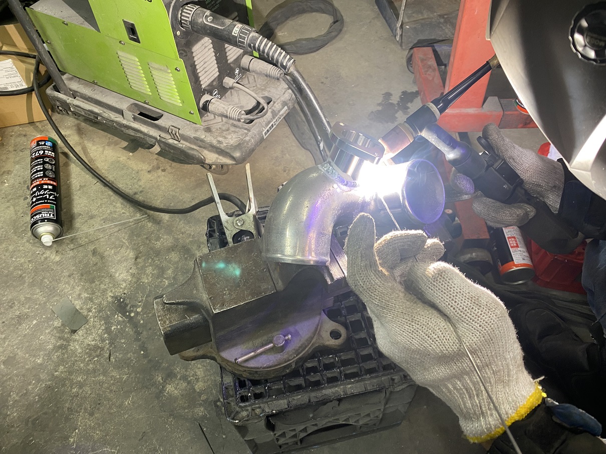 インテークパイプにブローオフバルブの土台を溶接中。