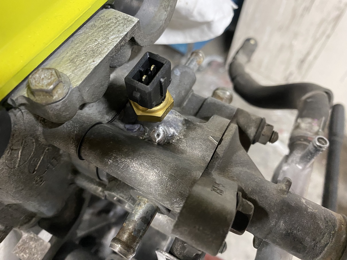 このエンジンコントロール用の水温センサー、取付け位置が重要なのでサーモスタット手前にセット。