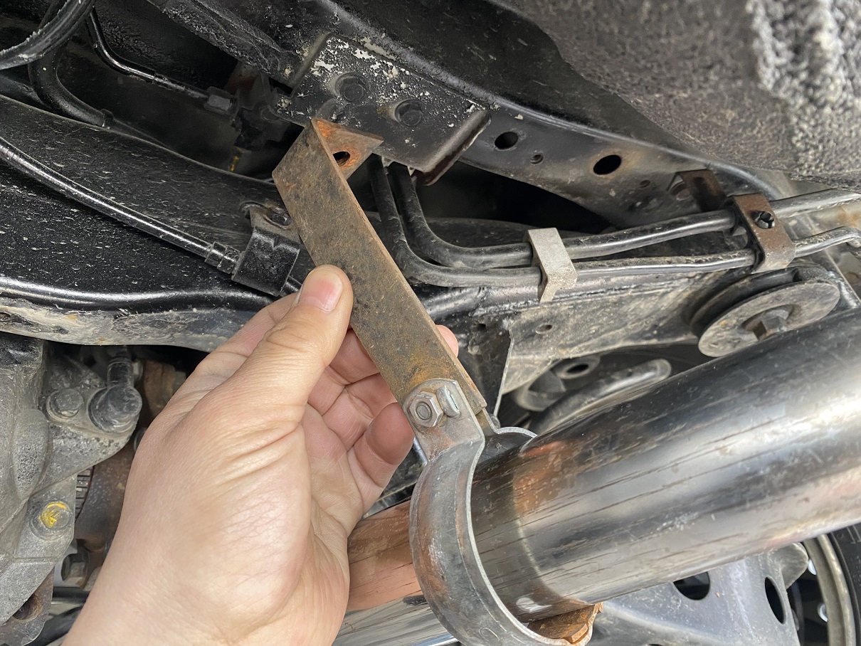 リアバンパー交換予定があるとのことでマフラーの高さを変更できるよう調整式のマフラーゴムで吊り下げ。