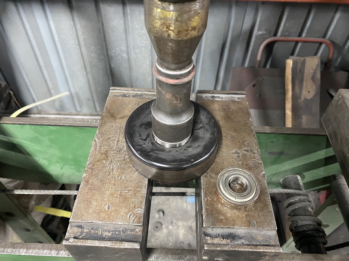 テンショナープーリーをテンショナー本体から取り外し、新品ベアリングへと圧入交換。