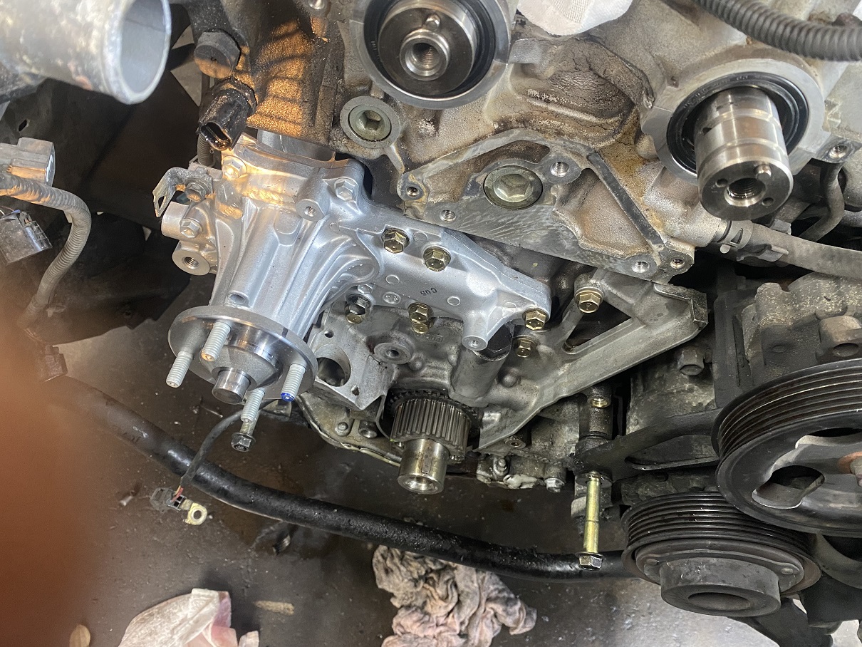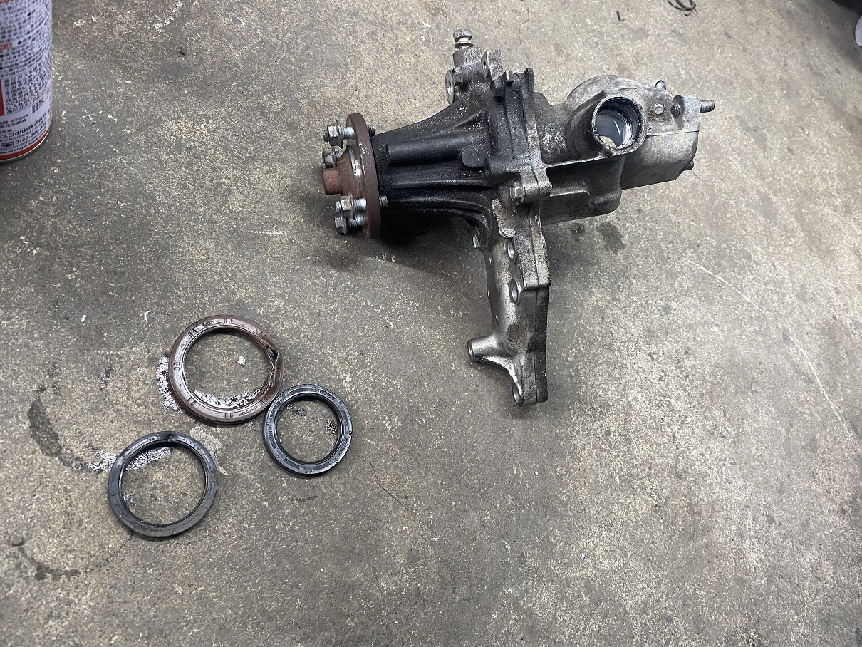 漏れたオイルでドロドロのウォーターポンプを新品へと交換しています。